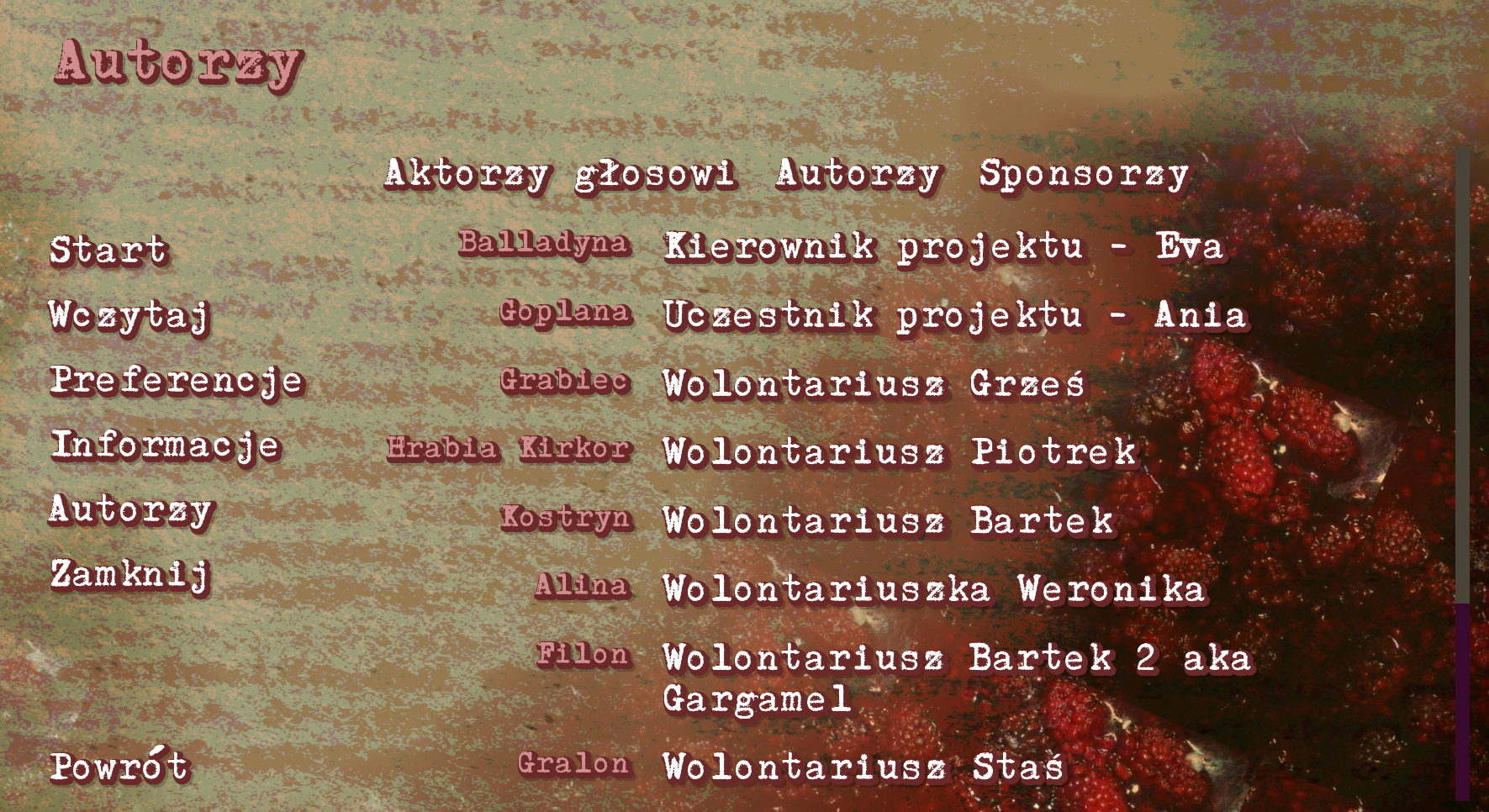 Projekt My Slavic Literature Adventure przychodzi z nietypowym rozwiązaniem dla wszystkich uczniów opornych na czytanie lektur z dialogami - trudno skupić uwagę na tekście? Problemy ze zrozumieniem lekko archaicznego języka? Niezbyt wciągająca forma? Rozumiemy, że nie wszystkim wszystkie lektury do gustu przypadną. Mimo tego, chcielibyśmy wciąż promować obcowanie z ojczystą literaturą oraz kulturą jednocześnie pomagając dzieciom i młodzieży w lepszym zrozumieniu materiału do egzaminu ósmoklasisty lub nawet matury. Dlatego właśnie w dwuosobowej drużynie z pomocą kilku wolontariuszy zarówno ze szkół podstawowych, jak i średnich tworzymy gry typu powieści wizualne na podstawie lektur. Naszym pierwszym projektem jest właśnie Balladyna VN - obecnie w produkcji. Już jest okazja zagrać w demo aktu pierwszego w wersji polskiej, które jest wstępem do oficjalnej wersji gry! Przejście samej wersji demo powinno zająć pomiędzy 10-20 minut, a jest to dopiero pierwszy z pięciu aktów, nad którymi obecnie pracujemy. Stworzyliśmy do gry naszą własną muzykę, grafiki, a nawet dubbing - chociaż jesteśmy amatorskim projektem, mamy nadzieję, że gra się spodoba. Przetestuj swoją wiedzę lub powtórz lekturę z nami!